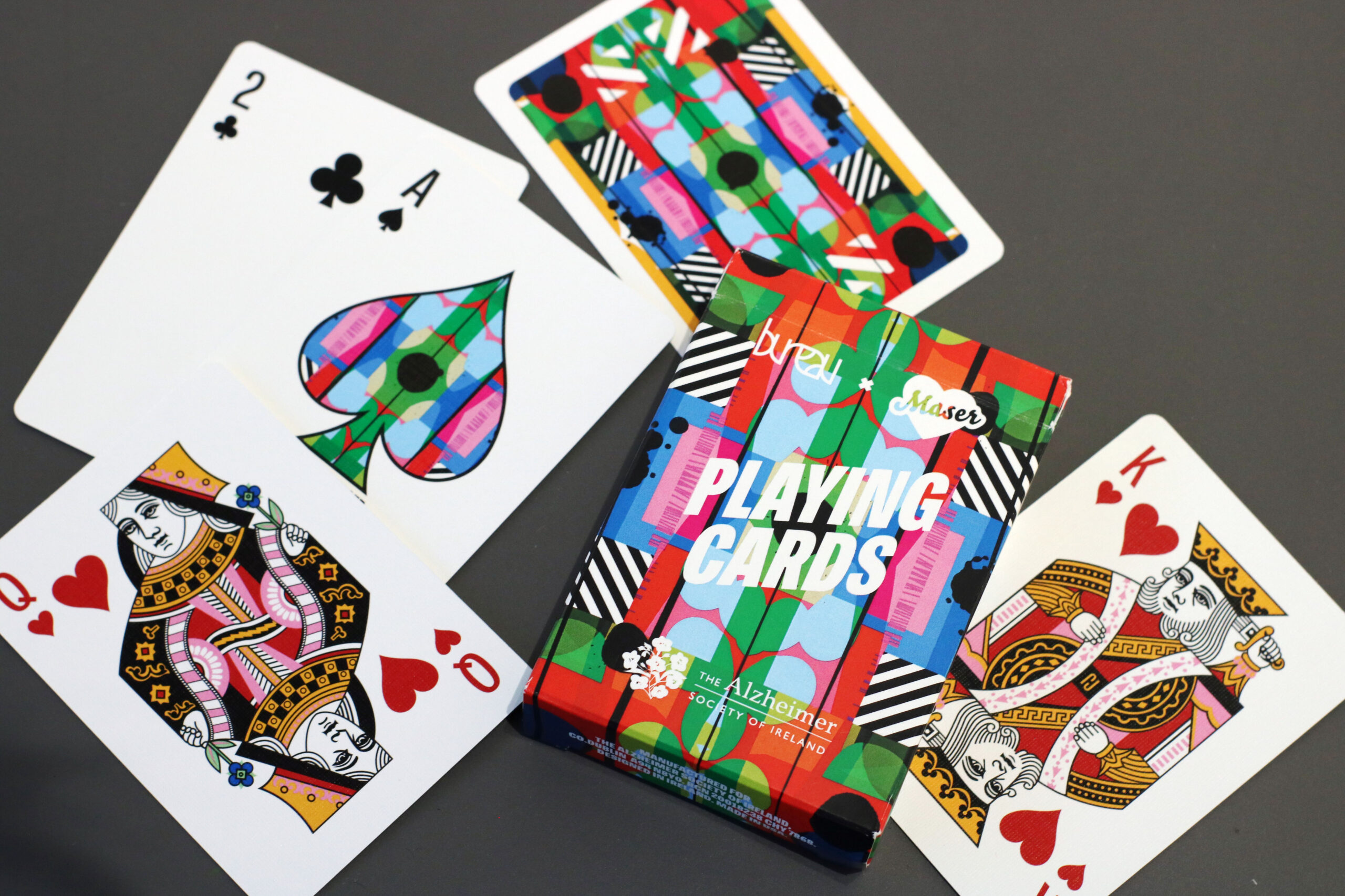 This is a limited edition set of playing cards designed by Visual Artist Maser and Designer Simon Roche of Bureau. The cards feature a custom Maser print, a specific colour palette, and twists on the traditional Royal Card sets.